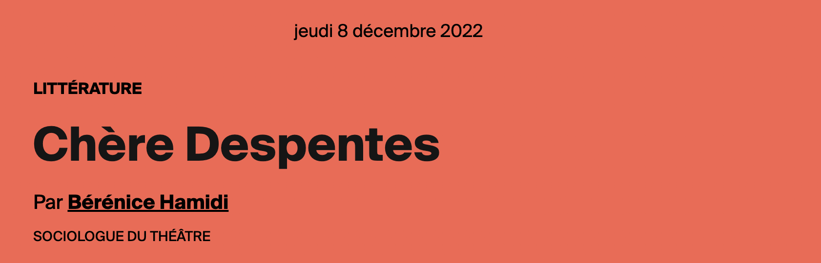 Commentaire : où j’essaie de déplier les raisons de ma gêne à la lecture du roman de Despentes et même un petit sentiment d’abandon, malgré mon respect pour son choix d’écrire depuis une forme d’empathie pour le « connard » du titre, et malgré mon accord avec l’extension du domaine de Metoo qu’elle propose avec cette catégorie du « connard », beaucoup plus répandue et problématique que le « gros porc ». Parce que c’est avec le connard qui ne s’est pas rendu compte et qui insiste sans le savoir, que viennent la « zone grise » et le « c’est